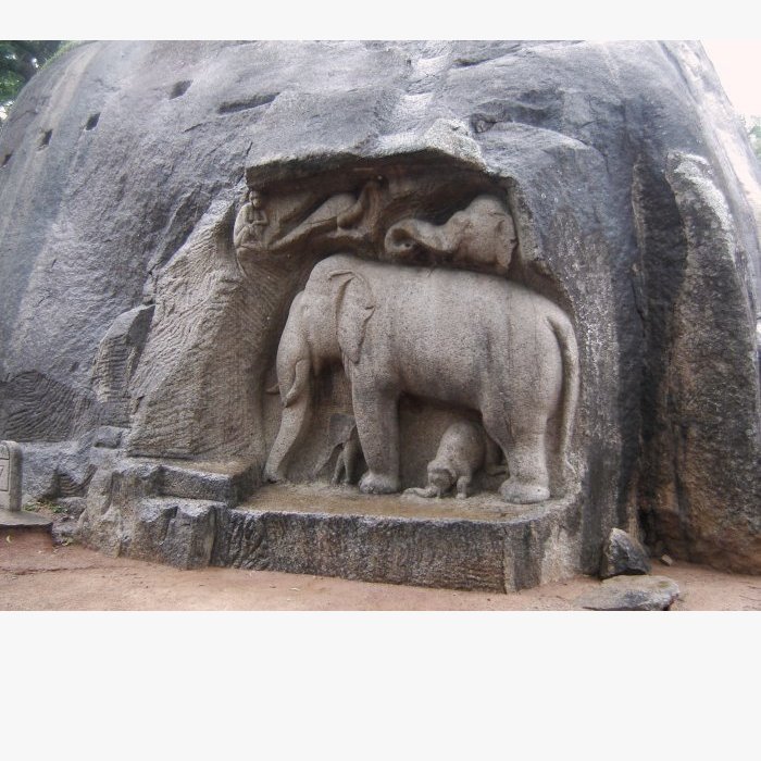 a beautiful carving of a group of elephants on the other side of the Trimurti mandapam