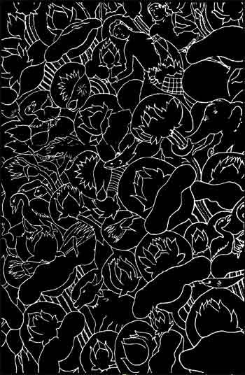 by gathering lotus flowers, while animals such as elephants, buffaloes