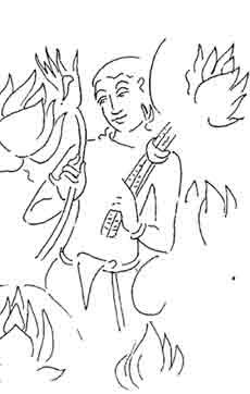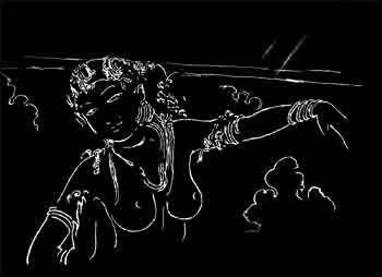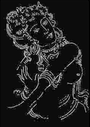 is apart from the others. He carries a bunch of lotus over his left shoulder